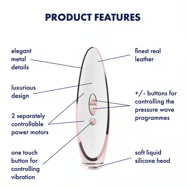 This luxury gem is designed with precious detail in mind. Featuring materials such as white leather, rose-gold accents, and soft medical grade silicone, this toy offers a refined touch for your cultivated taste and clitoral satisfaction.